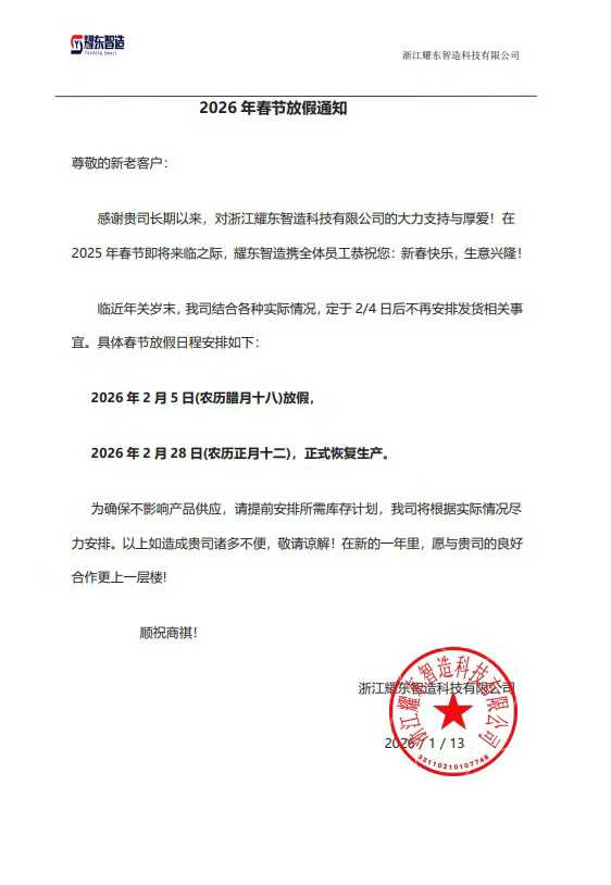 ঘোষণা অনুযায়ী, পণ্যের গুণমান নিশ্চিত করতে এবং প্রাক-ছুটির অর্ডারের সুশৃঙ্খল ডেলিভারি নিশ্চিত করার জন্য, Zhejiang Yaodong Smart Manufacturing-এর উত্পাদন লাইনগুলি 5 ফেব্রুয়ারি, 2025 থেকে সম্পূর্ণরূপে বন্ধ হয়ে যাবে। একই সঙ্গে, বসন্ত উৎসবের ছুটিতে লজিস্টিক চালানও স্থগিত করা হবে। কোম্পানী জরুরীভাবে সমস্ত নতুন এবং বিদ্যমান গ্রাহকদের ইনভেন্টরি বা অর্ডারের প্রয়োজনীয়তাগুলিকে সুযোগের চূড়ান্ত উইন্ডোটি দখল করতে এবং যত তাড়াতাড়ি সম্ভব তাদের অর্ডার এবং নিশ্চিতকরণ সম্পূর্ণ করার পরামর্শ দেয়। এটি কোম্পানিকে কার্যকরভাবে সম্পদ পরিচালনা করতে এবং ছুটির আগে পণ্যের চূড়ান্ত ব্যাচের সময়মত এবং গুণমান সরবরাহ নিশ্চিত করতে সক্ষম করবে।